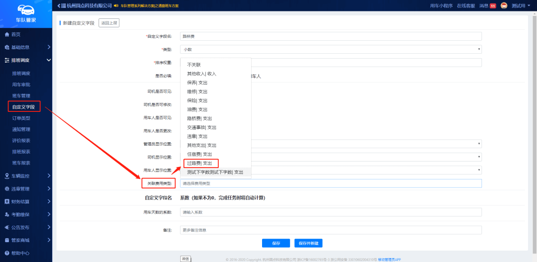 管理员新增关联费用的字段名,在排班任务完成后,系统将自动跳转到财务模块,并实时结算订单内的费用。